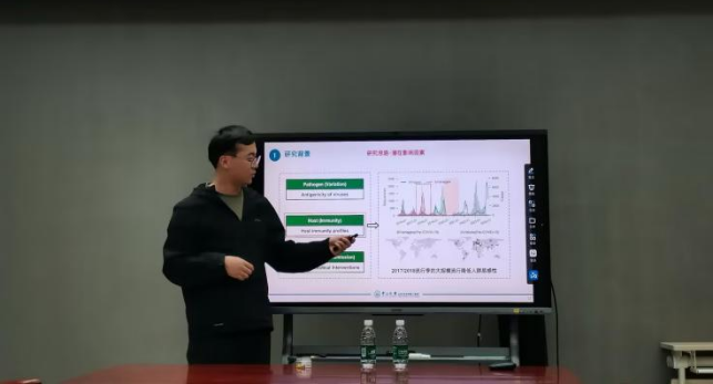 承接杜向军报告中所提出的科学问题,第二十七期沙龙中,博士研究生韩文杰作了题为“B型流感病毒Yamagata谱系潜在灭绝的机制研究”的学术报告。报告从系统流行病学视角出发,综合病原、环境与宿主三个层面,对该谱系可能灭绝的驱动机制进行了系统阐释。