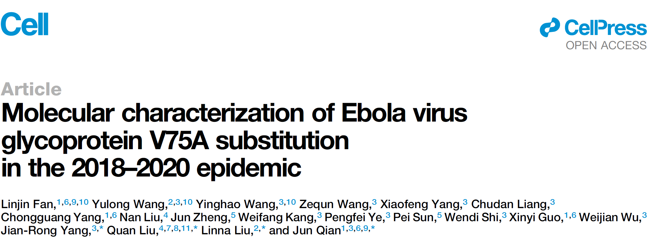 2026年1月23日,中山大学钱军教授团队联合广州医科大学附属市八医院刘林娜教授团队、吉林大学第一医院刘全教授团队以及中山大学杨建荣教授团队,在国际顶尖学术期刊Cell上发表了题为“Molecular characterization of Ebola virus glycoprotein V75A substitution in the 2018–2020 epidemic”的研究论文。