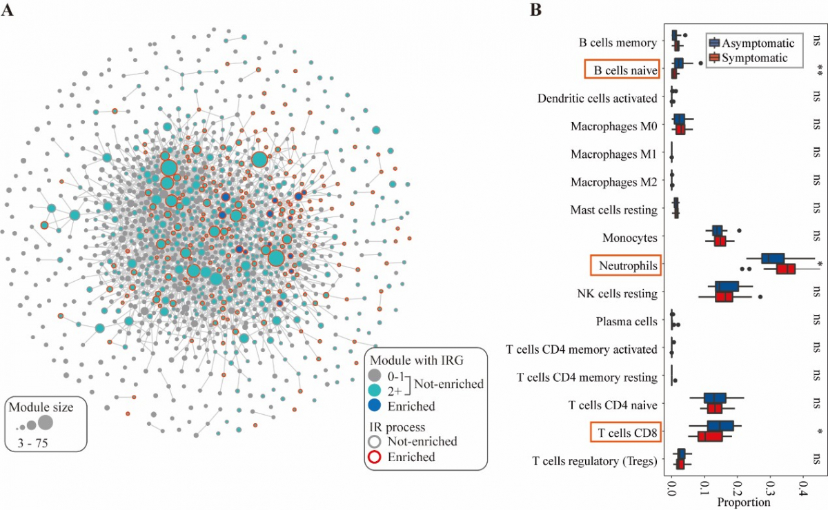 图1 基于网络HUPPI-2022识别的免疫功能相关模块及有症状组和无症状组的免疫细胞比例