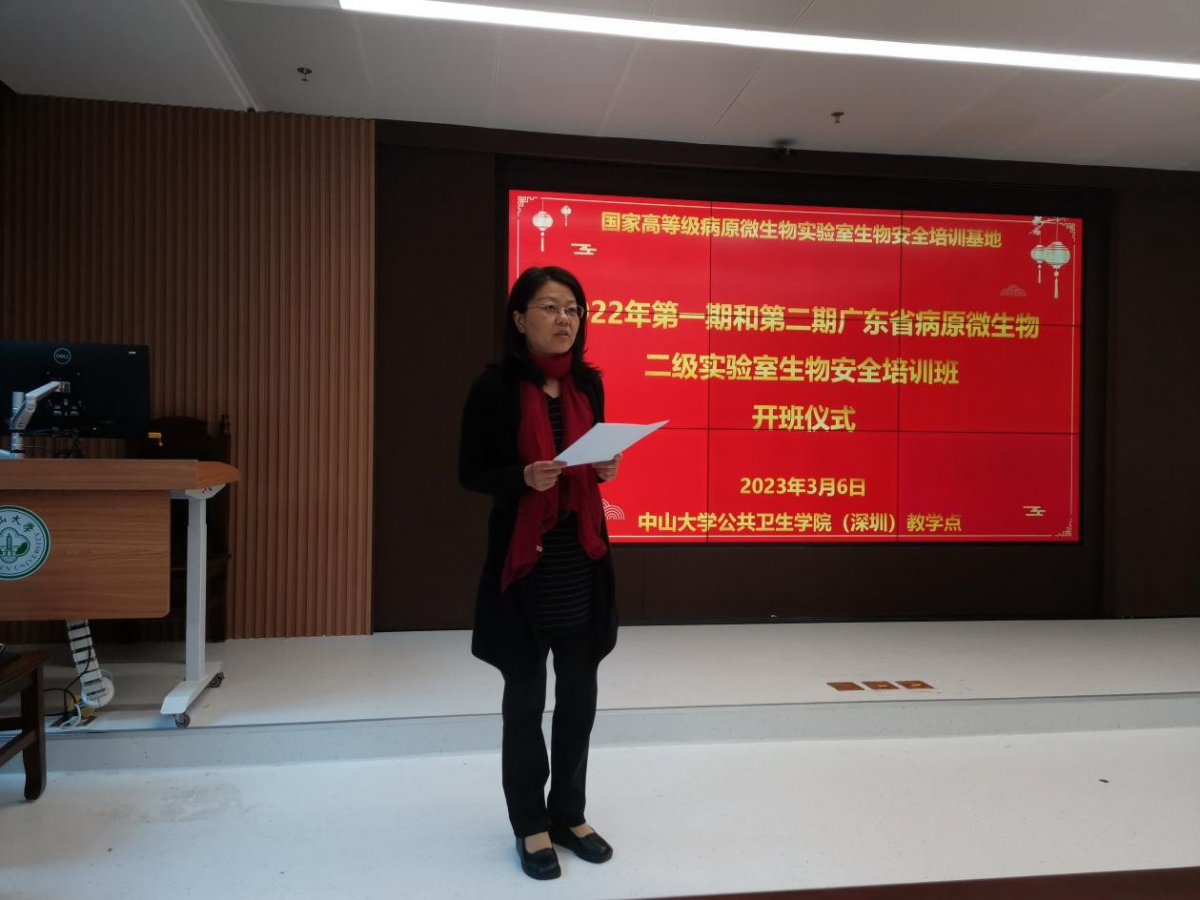 汪宗芳书记代表学院热烈欢迎来自全省的学员到我校培训学习,向学员们简要介绍了中山大学的概况,深圳校区的建设发展和学院的情况。她指出,学院正在建设高水平公共卫生学院,着力培养能解决病原学鉴定、疫情形势研判和传播规律研究、现场流行病学调查、实验室检测等实际问题的人才;学院拥有一批传染病防控和生物安全领域的人才,具备丰富的生物安全二级实验室管理和相关培训经验;此次还邀请了校外生物安全相关专家参加授课,丰富培训师资队伍;希望通过此次培训,学员们能进一步系统学习生物安全二级实验室理论知识、实验操作技术和应急处置等。汪书记表示,此次培训后,大家也是中山大学公共卫生学院(深圳)的校友,希望大家与学院深入交流、深化合作,共同探讨、谋划如何培养国家和人民真正需要的公共卫生人才。