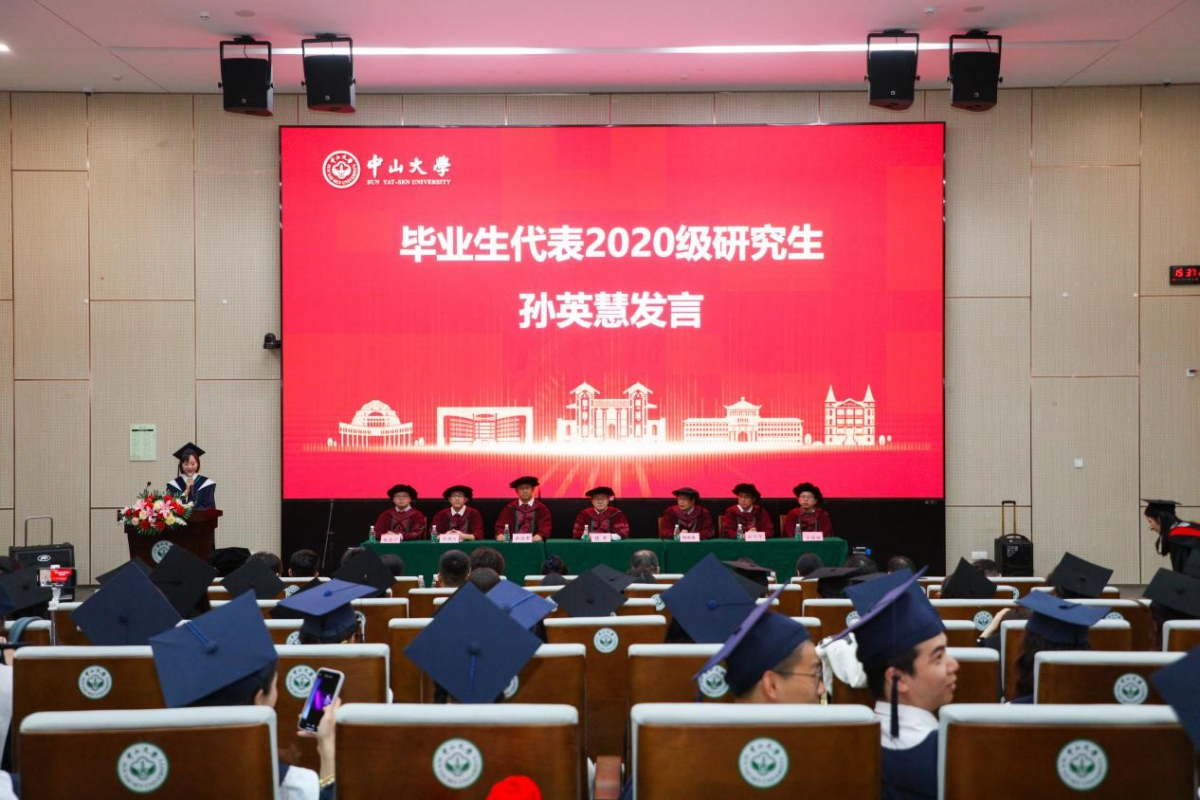 硕士毕业生代表孙英慧发言,她对学院老师的谆谆教诲与同学们的陪伴支持表示衷心感谢,分享了在学习和成长过程中的收获和感悟,勉励同学们要拥有仰望星空的勇气,亦不乏脚踏实地的态度,为同学们送上了最真挚的祝福。