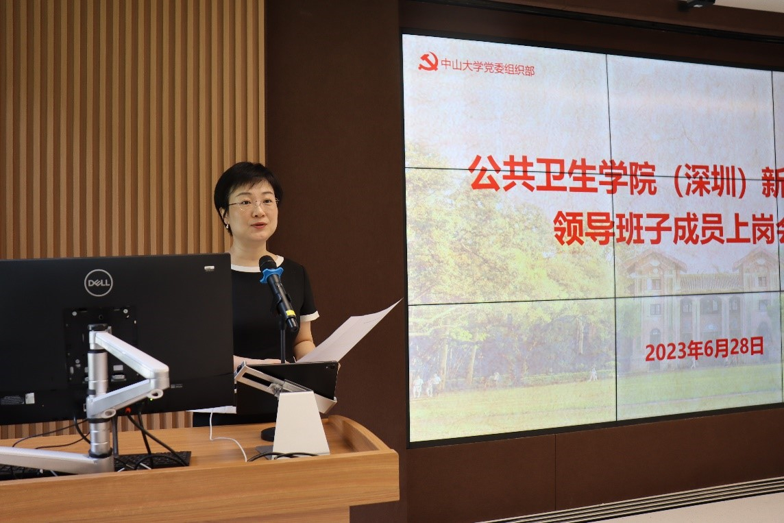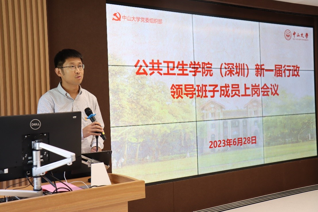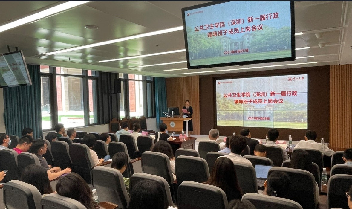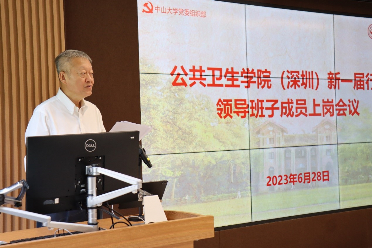 2023年6月28日上午,中山大学公共卫生学院(深圳)在医学园1-西101会议室召开新一届行政领导班子成员上岗会议,中山大学党委书记陈春声、党委组织部部长杨晓萌、学院领导班子和全体教职工参加了会议,会议由公共卫生学院(深圳)党委书记汪宗芳主持。